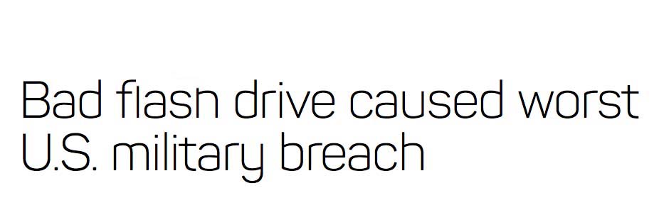 The USB virus "Agent.btz", which a class of autorun.inf virus, was placed on a number of USB sticks in the Middle East. The result was a major security breach of U.S. Military Security in 2008.